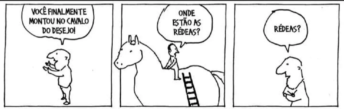 Há algumas semanas me deparei com uma tirinha de André Dahmer que ficou reverberando em mim. Nela, um personagem comemora ter finalmente montado no “cavalo do desejo”, mas logo percebe que não sabe onde estão as rédeas. A resposta final, quase despretensiosa, revela o ponto central: ele simplesmente não pensou nisso.