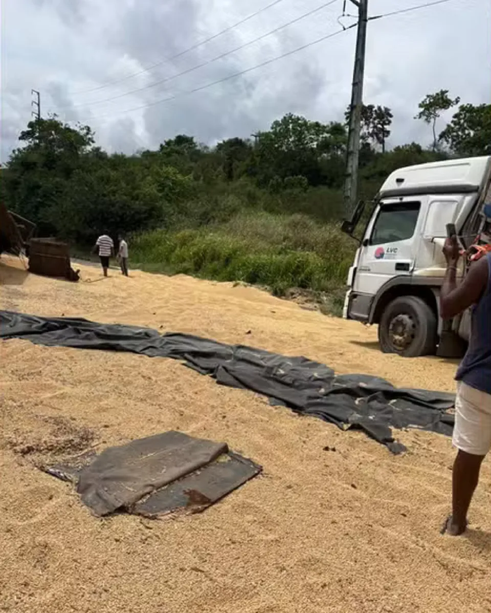Imagens compartilhadas nas redes sociais mostram a carga de soja espalhada pela rodovia.