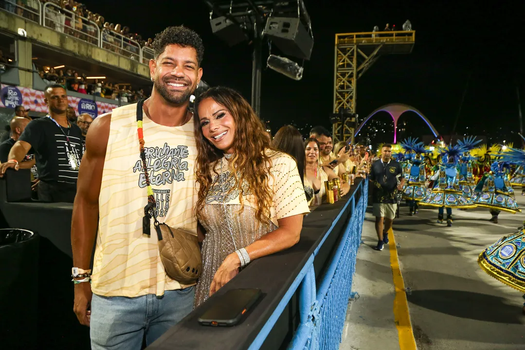 A atriz Viviane Araújo acompanhou de perto o desfile da Série Ouro do Carnaval, na Sapucaí, no Rio de Janeiro, neste sábado (14). A famosa foi fotografada aos beijos com o marido, Guilherme Militão.