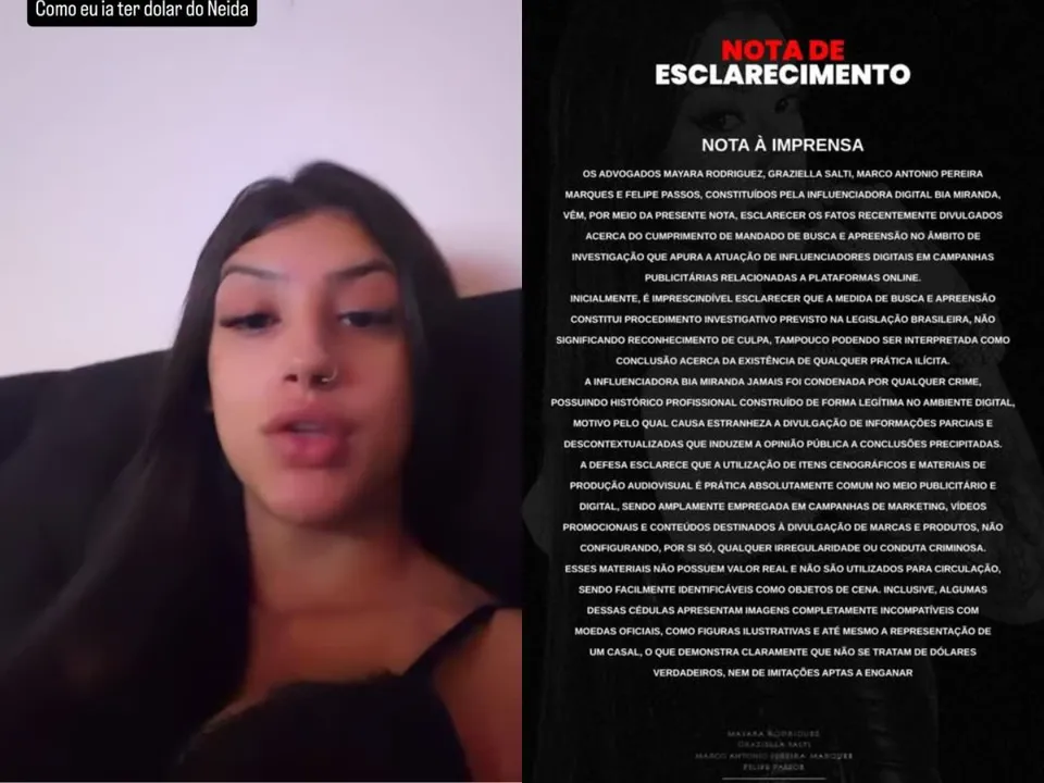 A influenciadora Bia Miranda, 21 anos, utilizou suas redes sociais neste sábado (28) para se defender das acusações que surgiram após ser alvo de uma operação da Polícia Civil (PC). Durante a ação, realizada na última sexta-feira (27), agentes apreenderam cerca de US$ 40 mil em dinheiro cenográfico na residência da jovem.