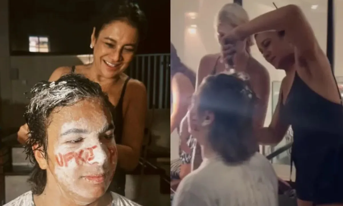 Dira apareceu sorridente enquanto participava da brincadeira, que incluiu banho de ovos e farinha de trigo. O ponto alto do registro foi o momento em que a própria mãe assumiu a tesoura e a máquina para cortar o cabelo do filho, um rito de passagem clássico entre os calouros brasileiros.