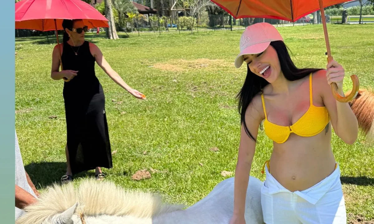 Em um momento fofo, Bruna compartilhou uma foto ao lado de um ponêi, que estava prenha. A influenciadora brincou com a situação e tocou a barriga do animal em um sina de semelhança. "Pônei gravidnha", brincou ela, encantando os seguidores.