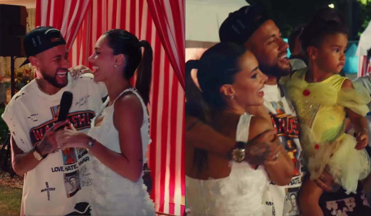 Em outro trecho, o casal trocou declarações. “Te amo”, disse Bruna após beijar Neymar. “Parabéns, amor, te amo mais”, retribuiu o jogador. Ainda durante a festa, eles brindaram com uma torre de taças de champanhe. “Mô, devagar… Mô, delicado”, brincou ela.