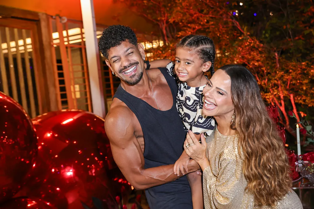Para a celebração, a intérprete de Consuelo, da novela "Três Graças", escolheu um vestido dourado repleto de brilho, combinando com sandálias de salto alto. Ela posou ao lado da família, recebendo um beijo carinhoso do esposo e momentos de afeto com o filho.