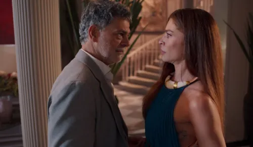 Rogério (Eduardo Moscovis) verá a cena de longe e não resistirá à vontade de provocar a ex-mulher. "Minha ex tá conferindo a assinatura do Giovanni Aragna... Ou procurando alguma cédula perdida dos milhões que você e seu amante roubavam e escondiam aí dentro?", debochará.
