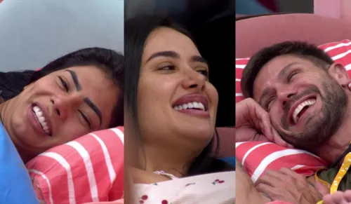 O líder entrou na onda e sugeriu uma contagem simbólica de votos, enquanto a amazonense seguiu no mesmo tom. “Bora combinar voto, galera? Tem quantos votos?”. Em clima de provocação divertida, Jordana reforçou a brincadeira e questionou se o grupo iria se unir ou se o medo de sair falaria mais alto.