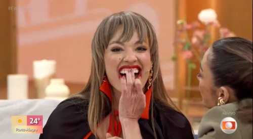 Bia reagiu com bom humor: "Aaah! Adoro ao vivo por causa disso, Brasil". Patrícia tratou a situação com naturalidade: "Volta e meia no meu dente também tem batom. Se não tem batom no dente, não é a Patrícia. Sempre tem batom no dente".