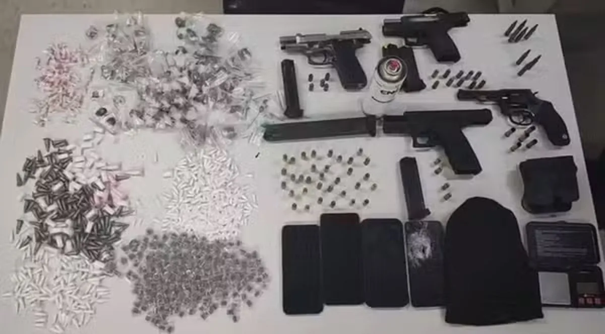 Durante a ação, os policiais apreenderam três pistolas calibres 9mm e 380, um revólver calibre 38, carregadores, munições e cerca de 1.000 porções de maconha, cocaína, crack e ecstasy.