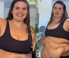 Tour pelo corpo Thais Carla reclama de excesso de pele após perder 75 kg: 'Caiu tudo' Influenciadora baiana realizou cirurgia bariátrica em abril e passa por processo de emagrecimento